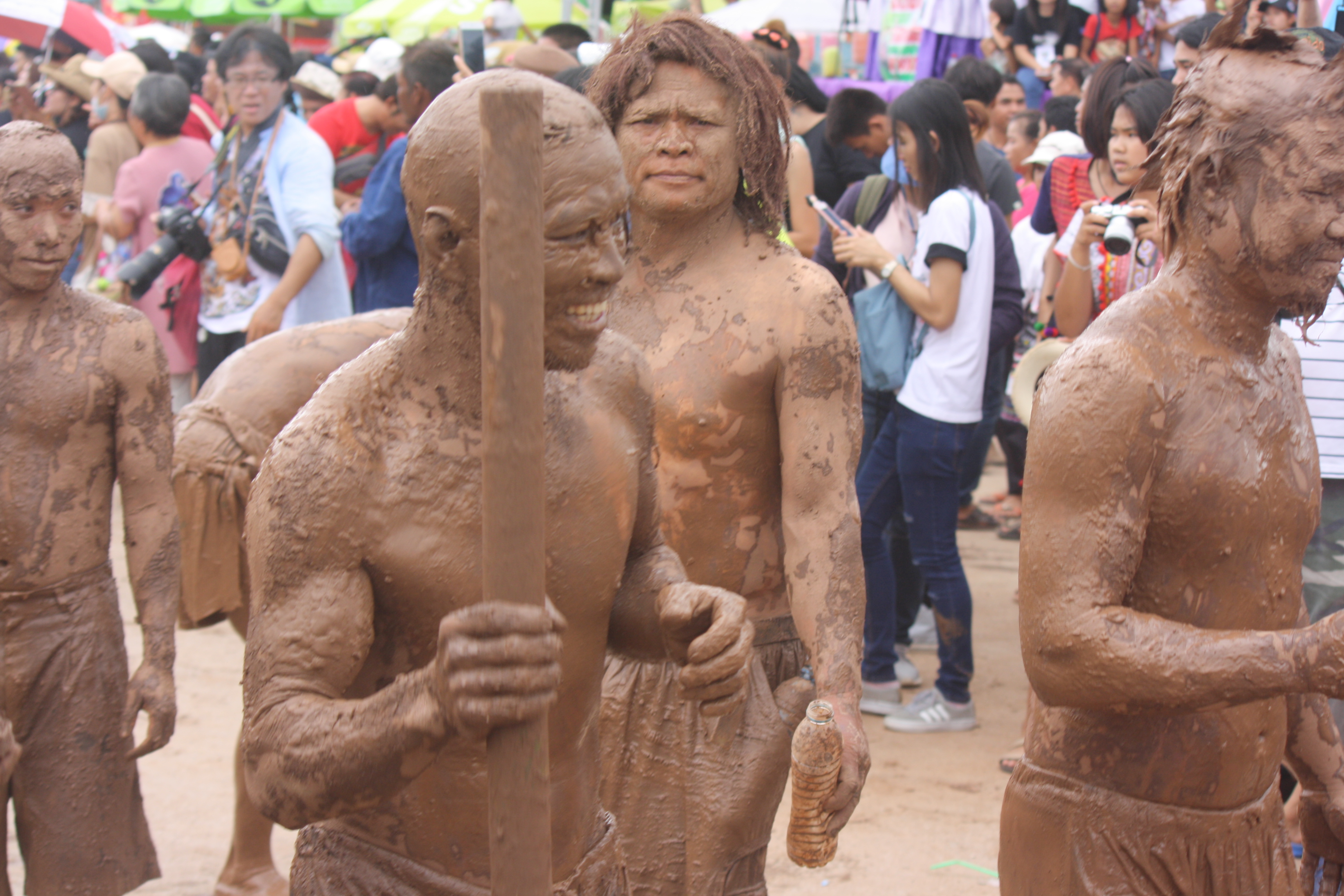 Mud men and buffaloes also relate to the fertility rites. The water buffalo symbolizes virility and strength, and is critical for planting and maintaining the fields. In the festival, one can see celebrants wearing water buffalo costumes, playfully charging the crowd. The mud men likely represent the fertile land itself…they travel along in the backs of pickup trucks filled with a mud bath, or walk along behind and perform antics such as throwing muddy fish nets about.