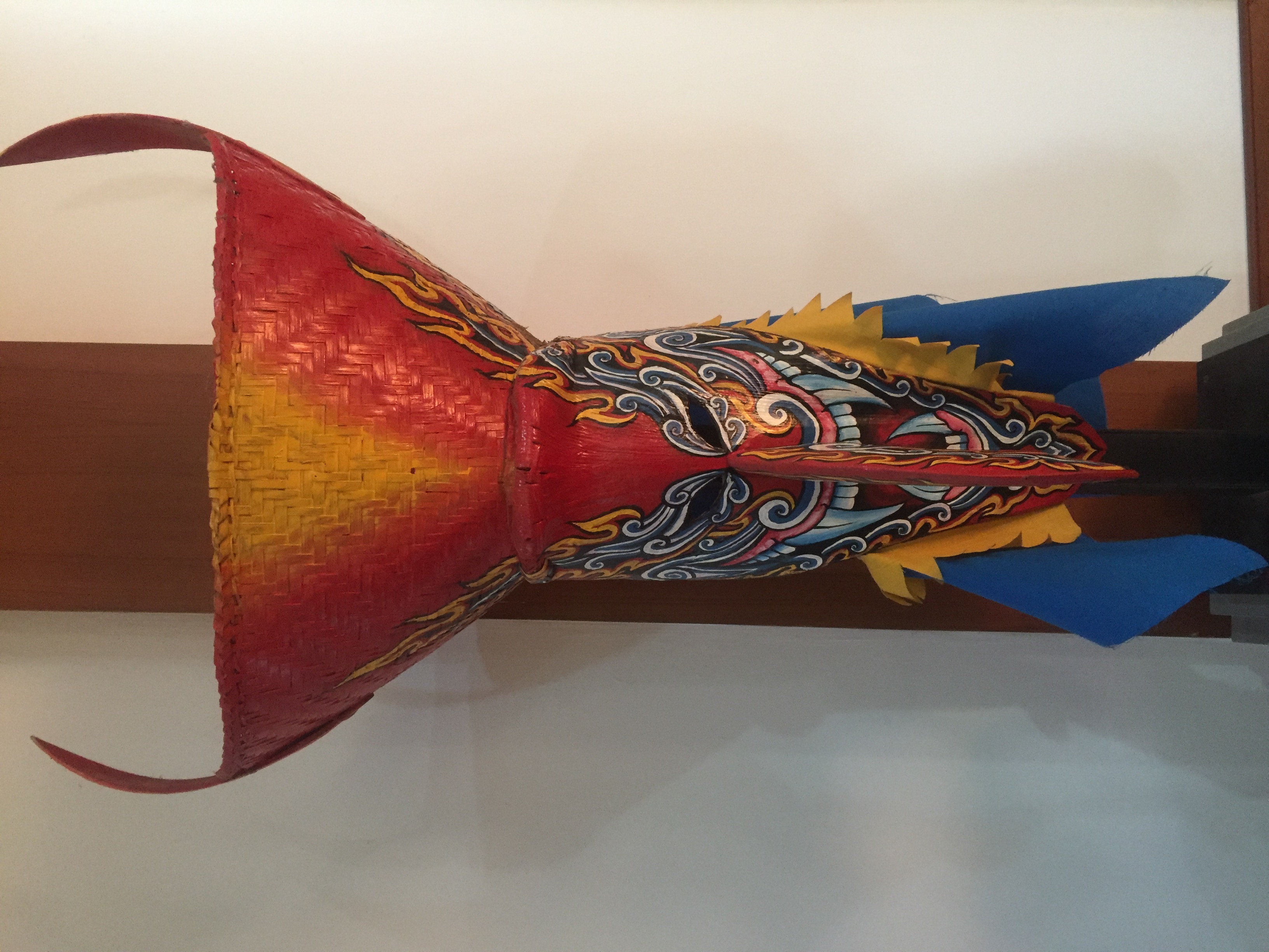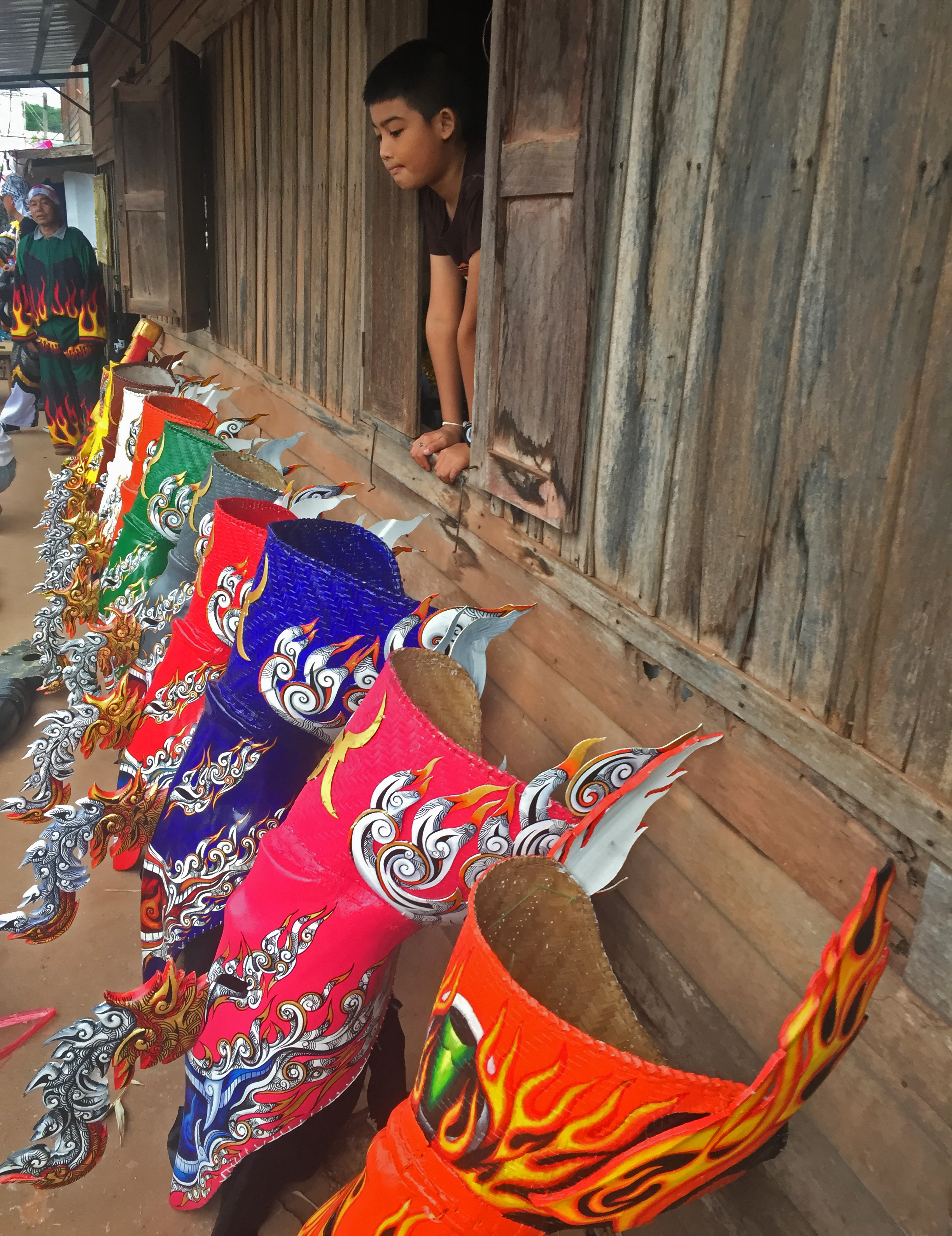 The large, horned headpiece of the brightly painted and artistic masks are composed of bamboo baskets used for steaming the regional specialty sticky rice (the basket’s name is “huad” in the local language). The faces are carved from wood, banana trunks, or other innovative material.