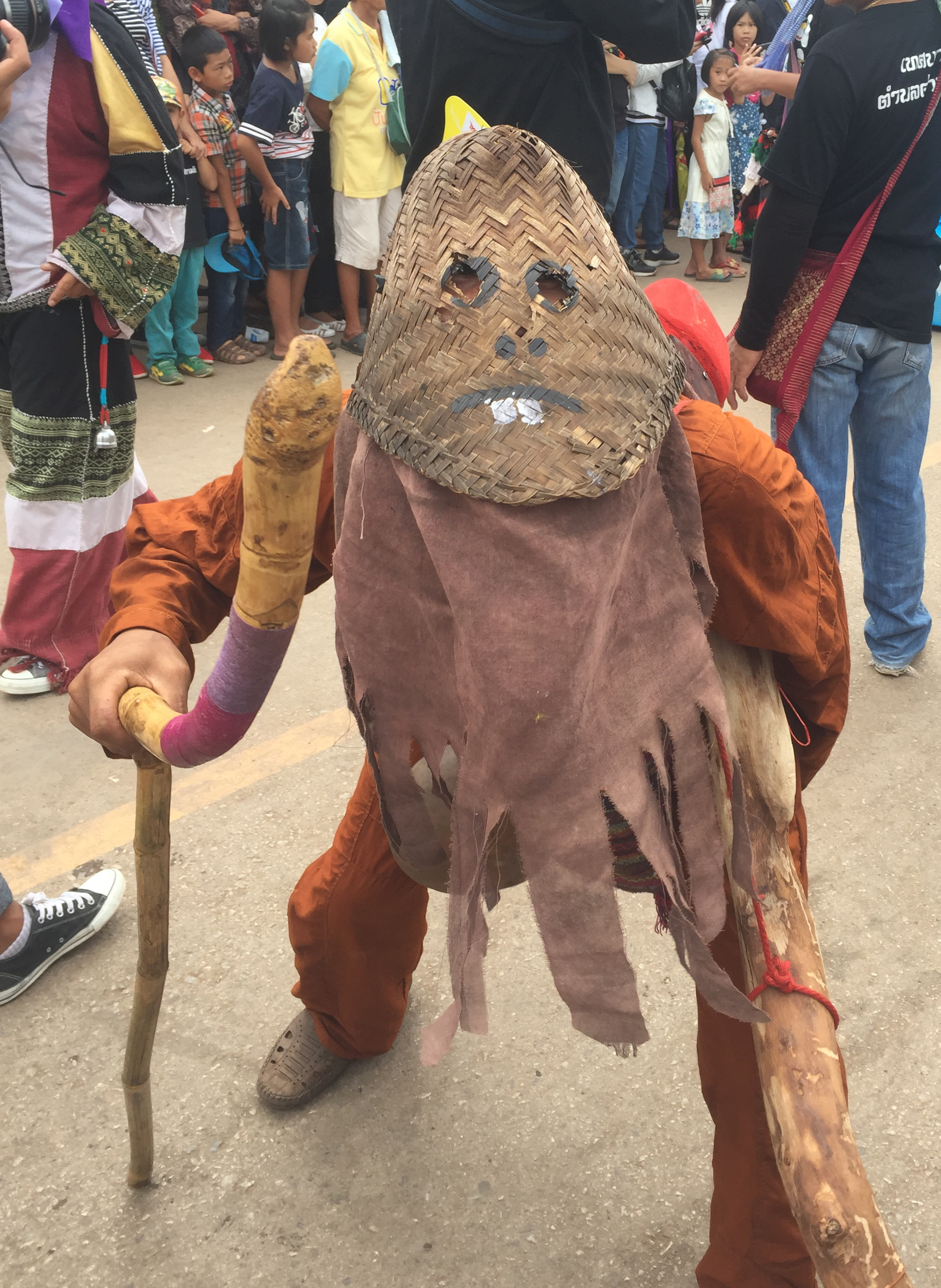 A Master’s degree dissertation from Rajabhat Institute in Loei proposes that the practice of wearing the ghost masks was passed on long ago from Luang Phrabang in the current nation of Laos. In the ancient Lan Chang Kingdom of Laos, Luang Phrabang tradition held a “Pu Yer Ya Yer” ghost mask performance in order to worship and appease ancestral spirits. According to one site on Lao folk tales, the Pu Yer Ya Yer legend arose as follows: “Many, many years, under King Khun Boromrajathirat, a huge tree rose from the earth and became so big its branches blocked out the sky and brought darkness and coldness to the earth. The king asked if anyone could cut down the tree. No one responded. Finally an odd couple named Pu Yer Ya Yer emerged and said they would give it a try. They labored for three months and three days and achieved their goal. The only problem was that they were standing in the wrong place at the wrong time when the tree fell and their spirits are remembered today.” You can see a traditional performance of the Pu Yer Ya Yer dance in this video, which appears to be a combination of traditional Chinese lion dance and local customs.