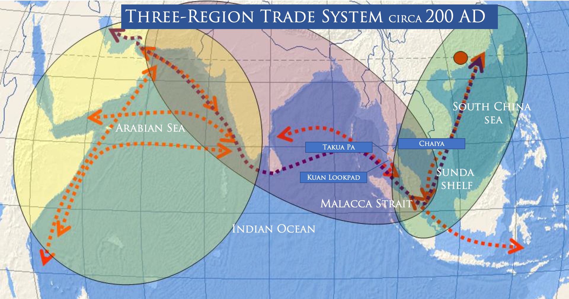 It was rare for a single person or ship to make the entire journey as that Roman envoy had done. Whether by the northern land route above the Himalayan range, or by the southern maritime route, trade goods usually travelled in stages, being handed off between local experts who could negotiate the local languages, tariffs, and political rivalries. The maritime system could be divided into three major areas: The Arabian Sea, The Indian Ocean, and The South China Sea. Kuan Lookpad stood in the nexus between the Andaman Sea, part of the Indian Ocean system, and the Strait of Malacca that led into the shallow waters of the Sunda Shelf and on to the South China Sea system. It was thus a transfer point, giving it a strategic position.